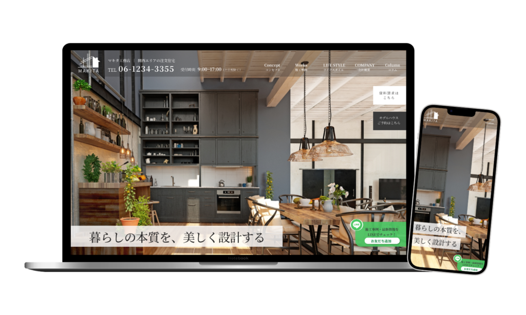 暮らしの豊かさを直感的に伝えるため、実際の住空間を大きく配置し、木の温もりと現代的な機能性が調和した空間デザインを前面に押し出しました。ナビゲーションは使いやすさを重視したシンプルな構成とし、スマートフォンでも同様の魅力が伝わるよう、レスポンシブデザインで一貫したブランド体験を実現しています。「暮らしの本質を、美しく設計する」というコピーで、単なる家づくりではなく、ライフスタイル提案としてのポジショニングを明確にしました。